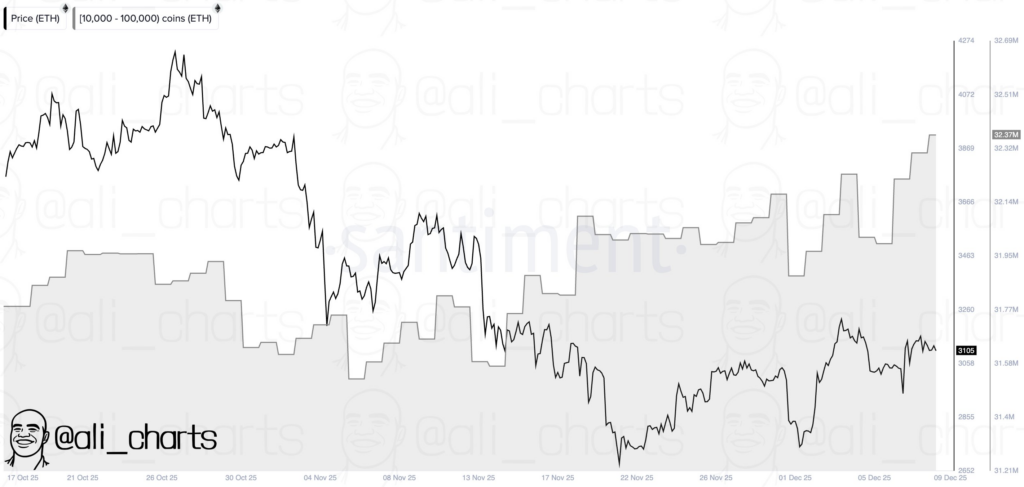 巨鲸囤积行为成为重要推手。分析师Ali Martinez援引Santiment数据指出,ETH巨鲸近月累计增持超80万枚代币,彰显其对资产的长期信心。