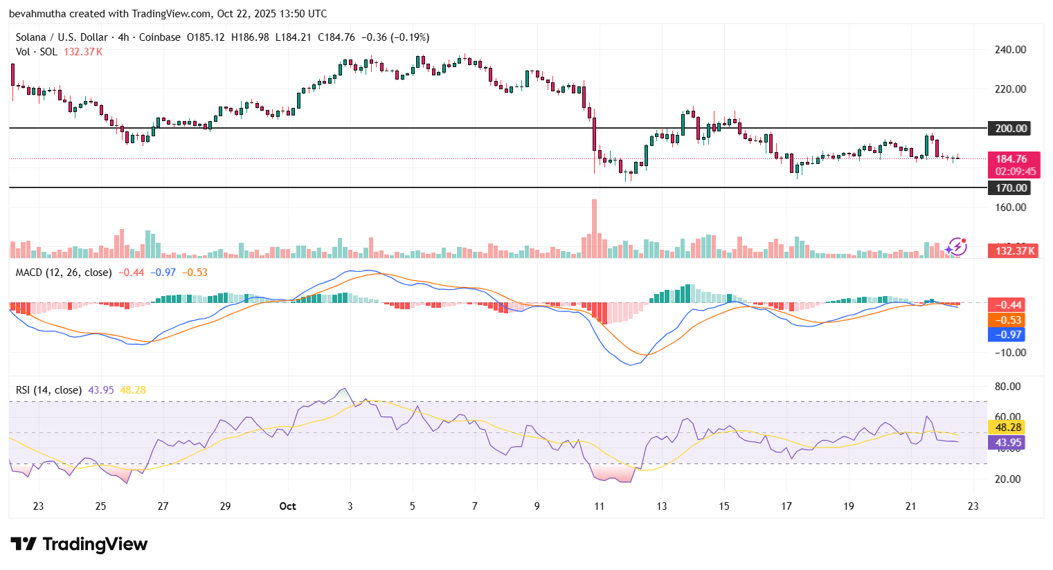 Solana价格目前交投于185美元关口附近,坚守在强力支撑位上方。近期加密货币市场整体走熊,SOL本周跌幅已超7%。尽管未能突破200美元阻力位,但该资产已显现企稳迹象。过去24小时交易量激增46.73%,达到82.9亿美元。