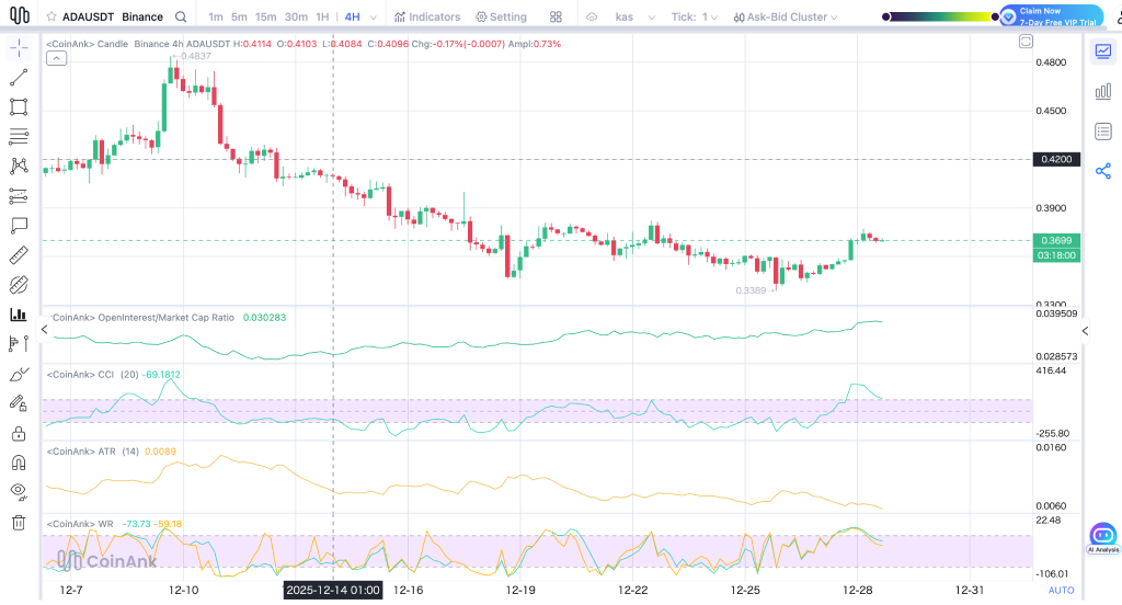 各项指标与价格走势形成印证:动量指标已脱离超卖区间,这解释了抛售放缓的原因,但尚未显现强劲多头能量。波动率同步下降——ATR指标持续走低,通常意味着市场进入休整期。这种状态往往出现在重大行情前,但也意味着ADA若要突破上行需要更大成交量支撑。威廉指标接近中性区域,再次表明价格未出现单边极端走势。