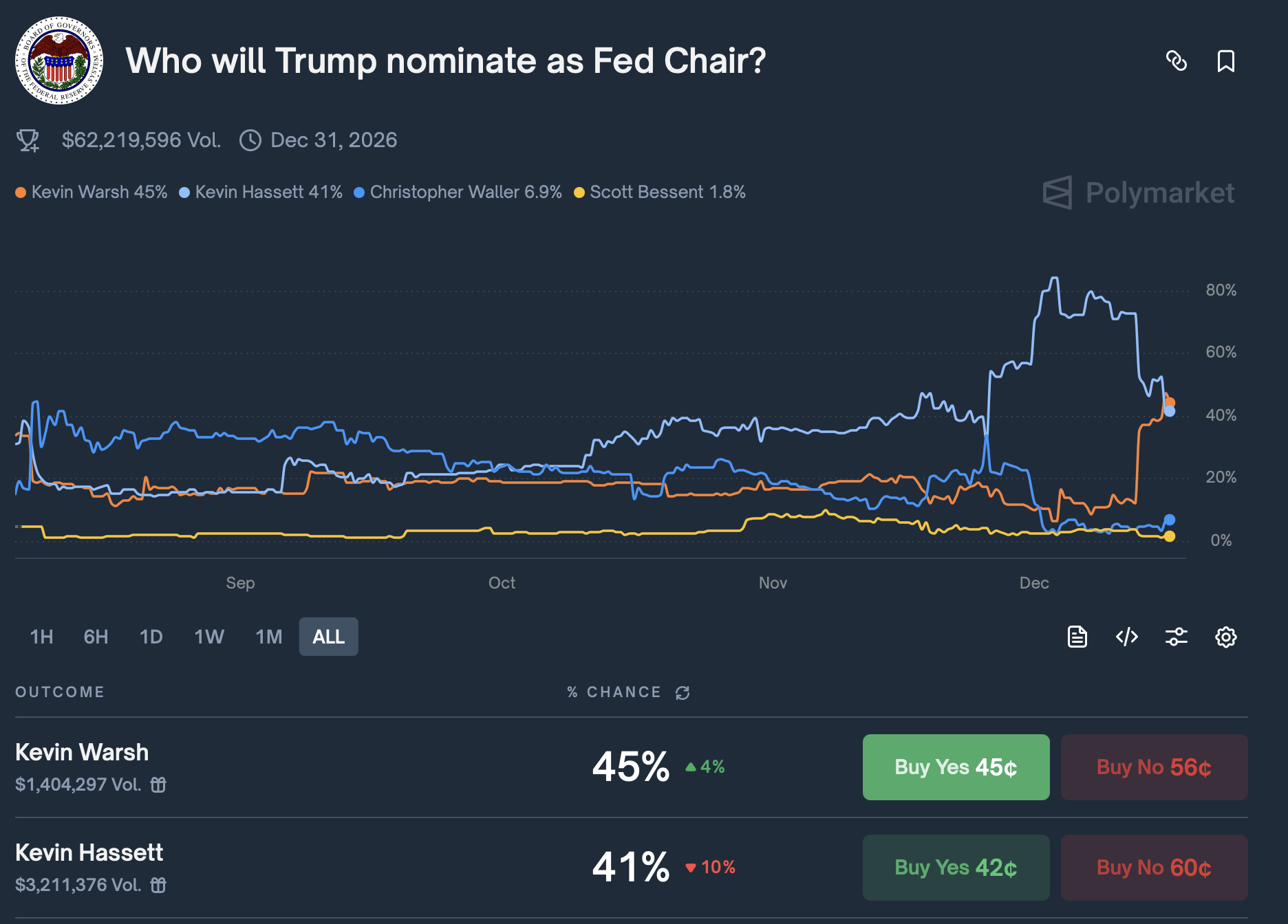 Polymarket图表显示凯文·沃什以45%的概率保持领先,凯文·哈塞特以41%紧随其后。两人之间的微小差距表明竞争日趋激烈。