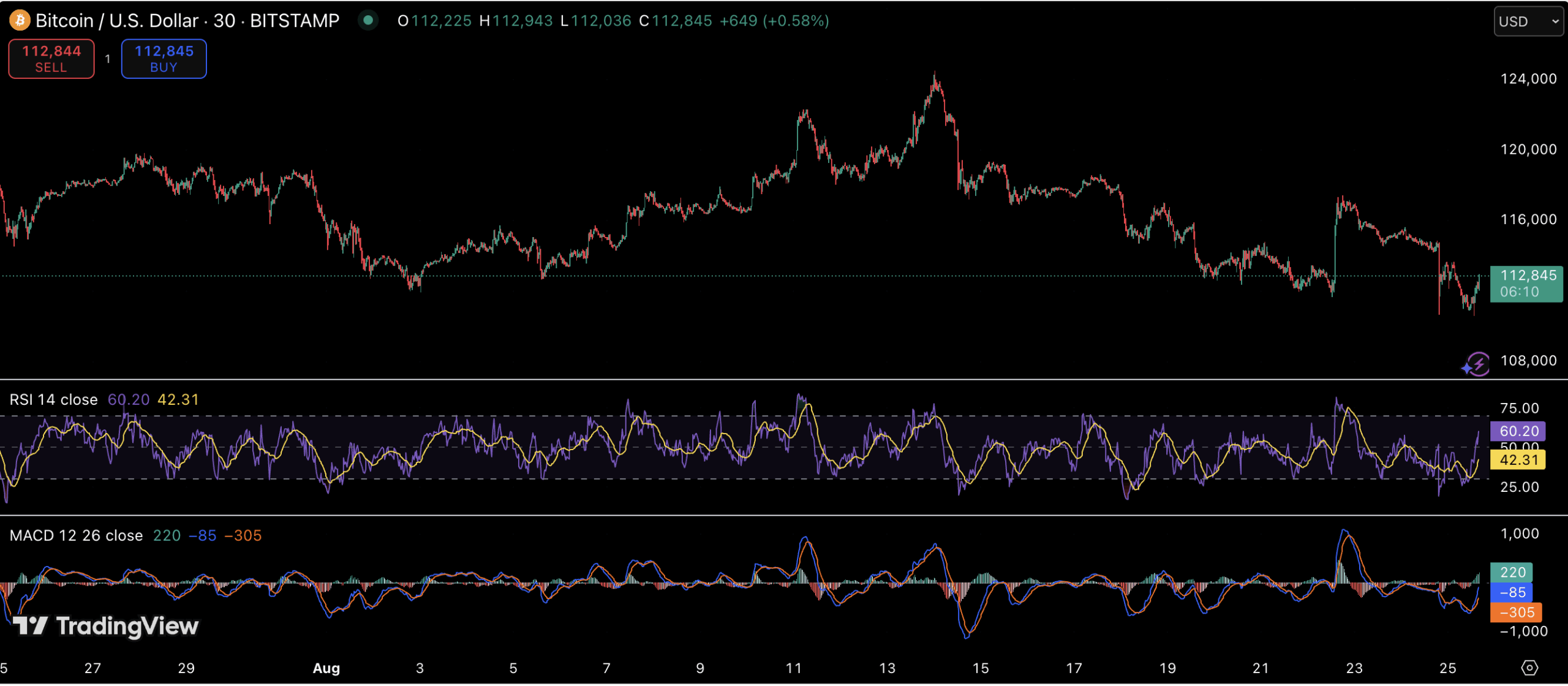 比特币价格走势同样反映出市场不确定性。Bitstamp交易数据显示,BTC在短暂下探112,036美元后迅速反弹,相对强弱指数(RSI)徘徊于中性区间,MACD指标则释放矛盾信号。尽管近期波动剧烈,比特币年内涨幅仍达76%,彰显其整体看涨趋势的韧性。