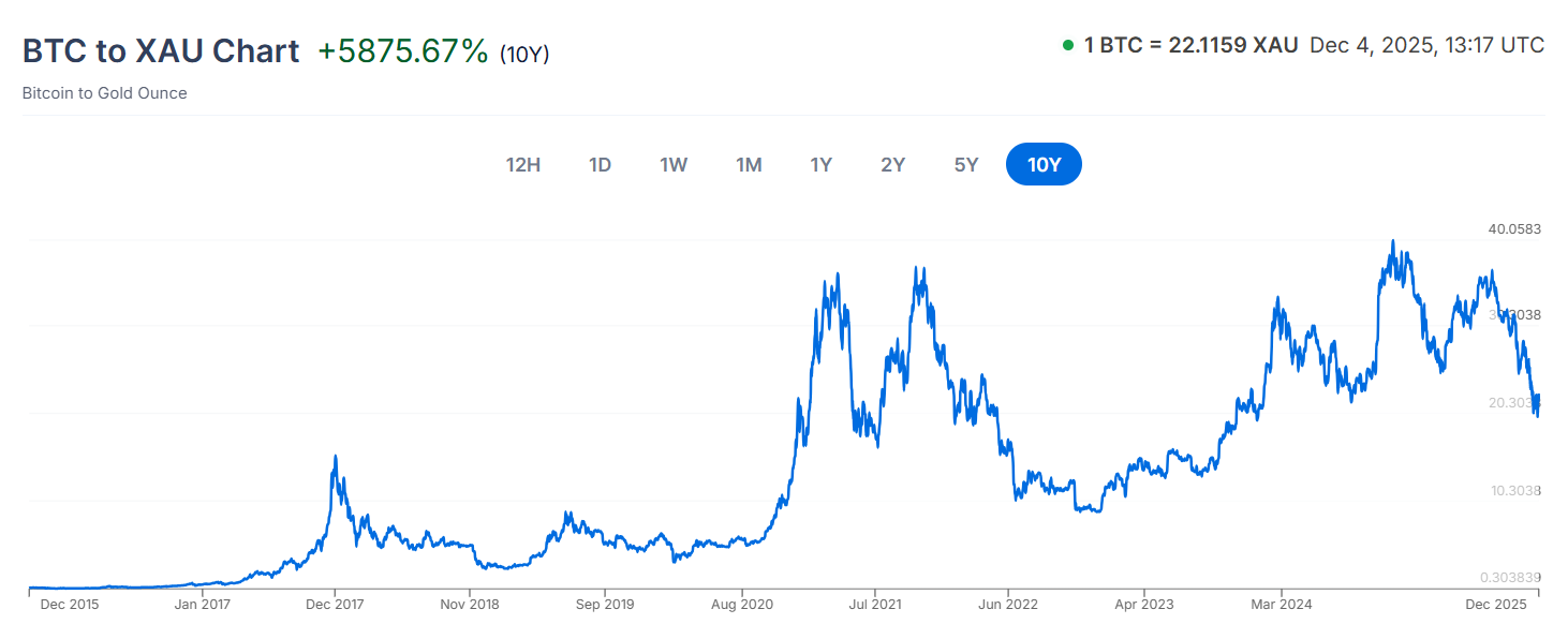 希夫提出以黄金衡量的比特币价值较四年前下跌40%。数据显示2021年12月4日1BTC价值超过30XAU,而2025年12月4日价值约22XAU。