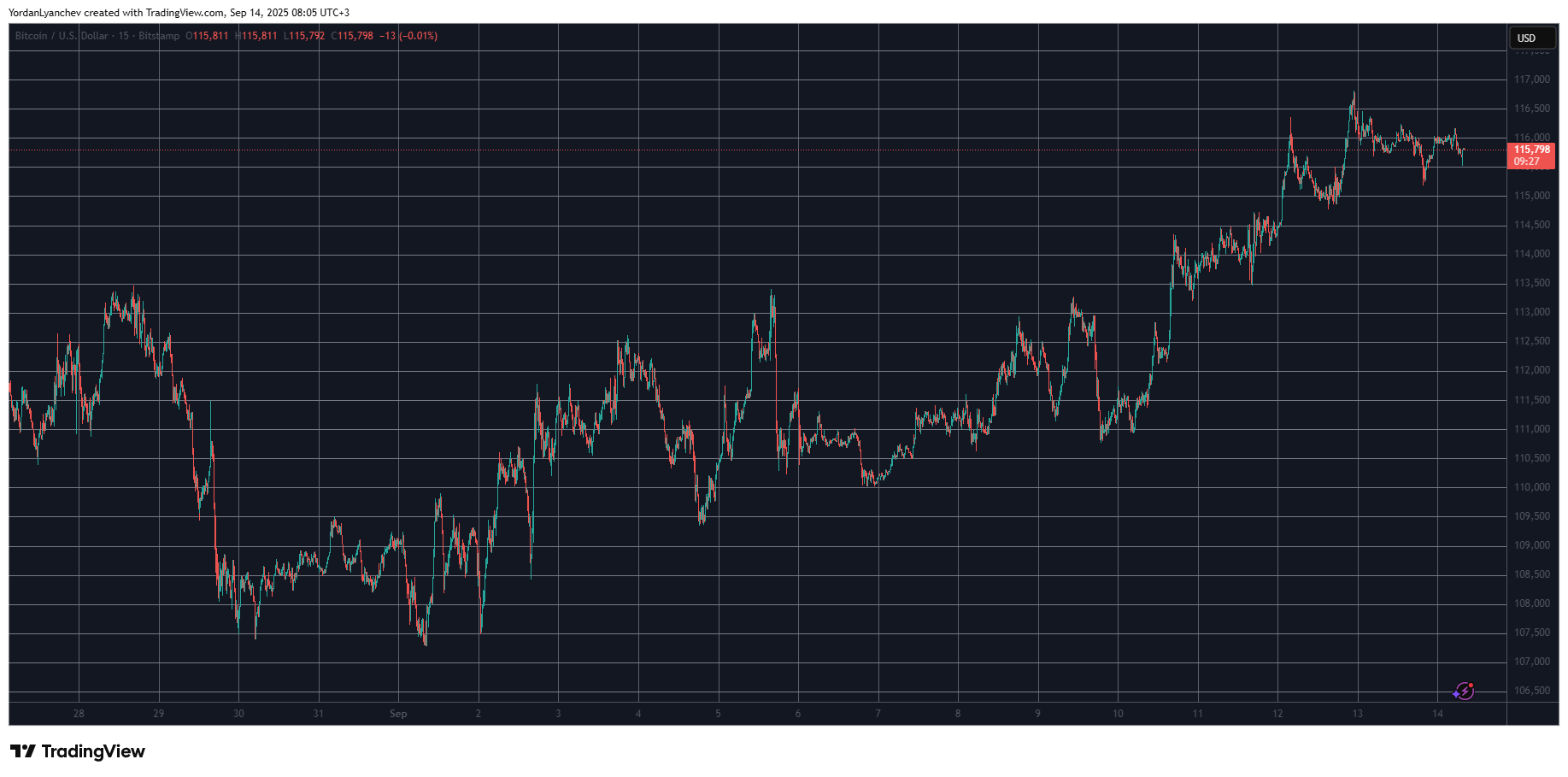 转折出现在9月10日,比特币成功突破该阻力位后便势如破竹。周五更是一度逼近116,000美元大关。周六早间多头虽短暂推动价格触及116,700美元的阶段性高点,但未能延续涨势。截至发稿时,价格回落至116,000美元下方——考虑到昨日美俄/中美关系紧张带来的宏观经济风险,当前价位仍属亮眼表现。