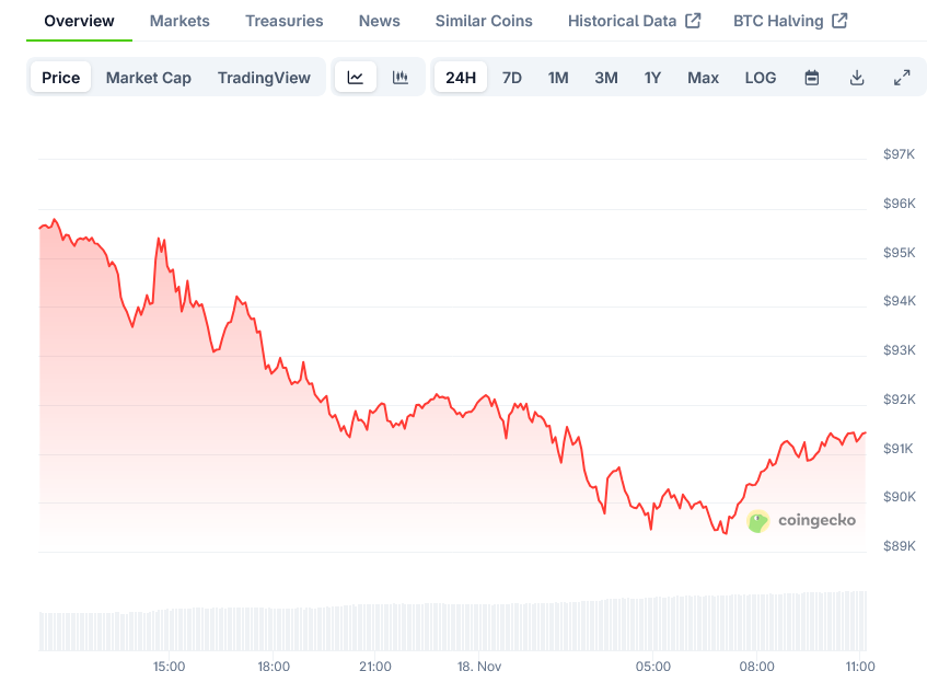 在大户增持的同时,比特币周二跌至89550美元,较10月6日126000美元的历史高点大幅回落。小型持有者似乎承受更大压力,持有1枚BTC以上的钱包数量从10月27日的980577个降至11月17日的977420个年度低点。