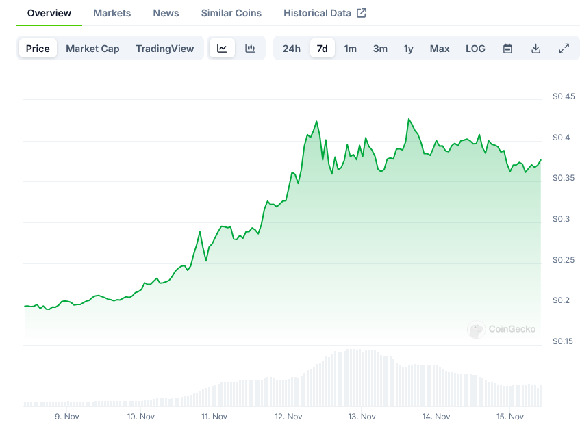 狗狗币价格自大选日以来已翻倍,达到三年来的高点,加密货币市场对特朗普的胜选以及随后宣布成立的与这一迷因币同名的新政府部门做出了积极反应。价格在大选结果公布后立即开始上涨,截至周四下午,狗狗币交易价格为0.39美元。这比大选前水平上涨了超过100%,使其成为这一时期表现最佳的数字资产之一。