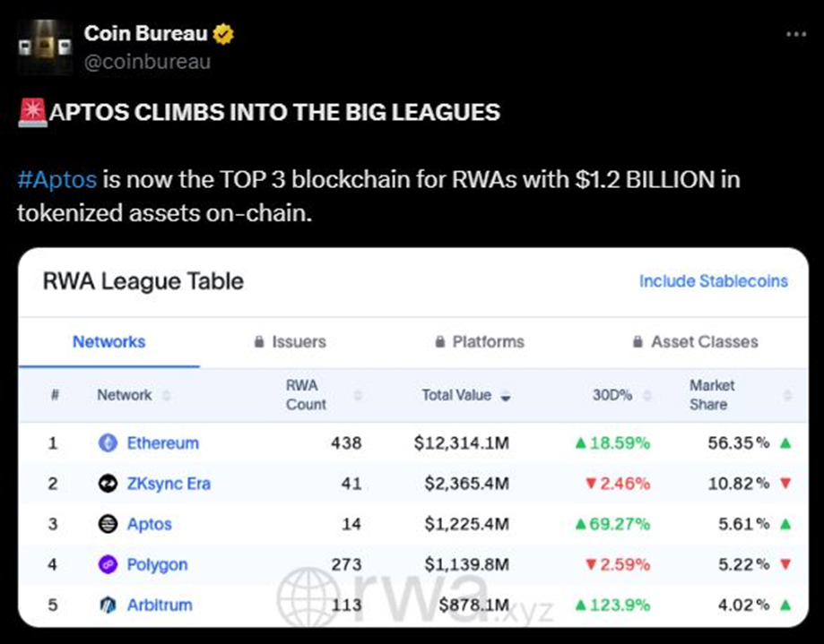 最新RWA排行榜数据显示,Aptos以约12亿美元的代币化资产总值位列第三。过去30天其RWA价值增长超69%,成为该领域增速最快的区块链之一。