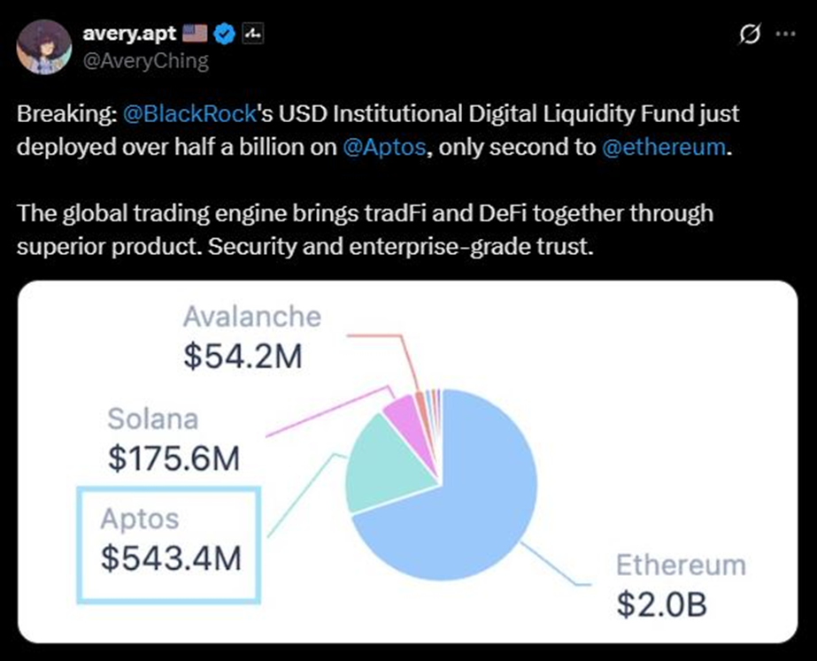 更值得关注的是,Aptos正获得传统金融机构的青睐。据报道,贝莱德机构数字流动性基金向Aptos网络分配了5.43亿美元,成为其第二大投资标的,而最大份额20亿美元则流向以太坊网络。
