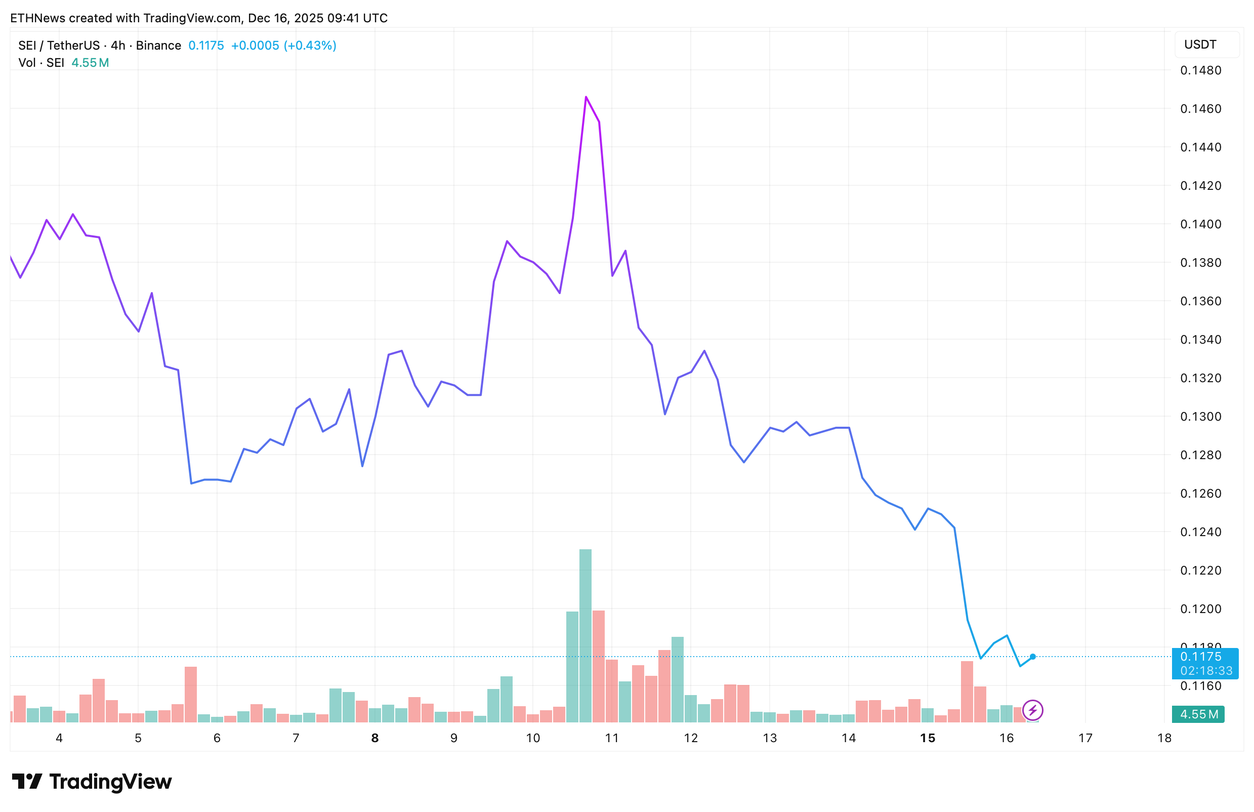 SEI/USDT的4小时 TradingView 图表为此观点提供了依据。当前价格在0.117-0.118美元附近交投,略高于马丁内斯提及的关键0.12美元区域。近期K线显示价格缓慢下移而非剧烈抛售,表明空头动能减弱而非寻求跌破。成交量保持温和,未出现大规模恐慌性抛售,这支持市场正在进入整理阶段的观点,即价格正在消化前期跌幅而非扩大损失。