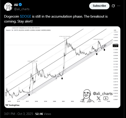 分析师Ali Martinez指出,DOGE持续在上升通道内运行——该形态表现为随时间推移形成更高的高点和低点。历史数据显示,0.13美元附近区域在先前回调中屡获买方防守,这与早期周期中的反弹走势相呼应,为新一轮上涨奠定了基础。