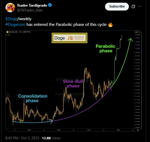 Trader Tardigrade从更宏观视角指出,周线图显示DOGE正从慢牛阶段向加速上涨过渡。此前突破0.40美元已释放动能增强信号,若趋势延续,0.75美元和1.00美元将成为重要心理关口。这种"抛物线阶段"通常伴随波动加剧,需明确风险标记。