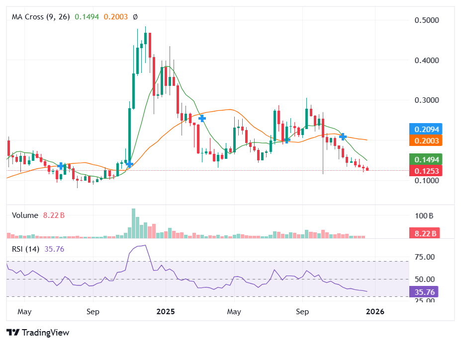 值得注意的是,这种死亡交叉形态对DOGE及相关山寨币而言并非新现象,它能清晰预示市场何时将出现好转。对投资者而言,利好消息来自相对强弱指数(RSI)读数为35,表明狗狗币已处于超卖状态。尽管目前处于盘整阶段,但最终有望实现价格突破。