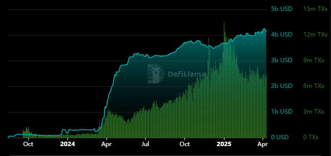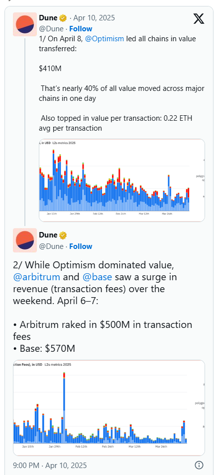 在2024年第四季度的市场反弹中,Base作为以太坊Layer 2网络在交易量方面脱颖而出。尽管市场环境动荡,数月后的今天,它仍然保持着领先地位。尽管关税战争对加密货币市场产生了负面影响,但以太坊生态系统仍保持着健康的活动水平。这些活动大多发生在Layer 2网络中,而Base在关键领域继续保持着以太坊Layer 2网络的领先地位。