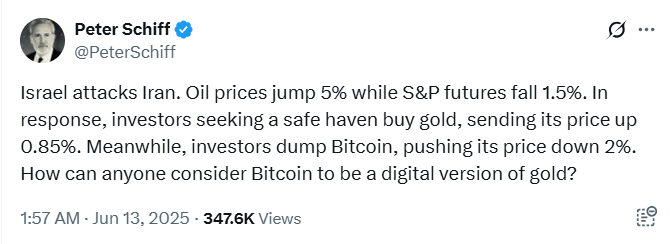 著名比特币批评家彼得·希夫(Peter Schiff)近日暗示,黄金已取代比特币成为首要的价值储存手段。他在X平台发帖指出,中东地缘政治事件暴露了不同资产的真实强度。