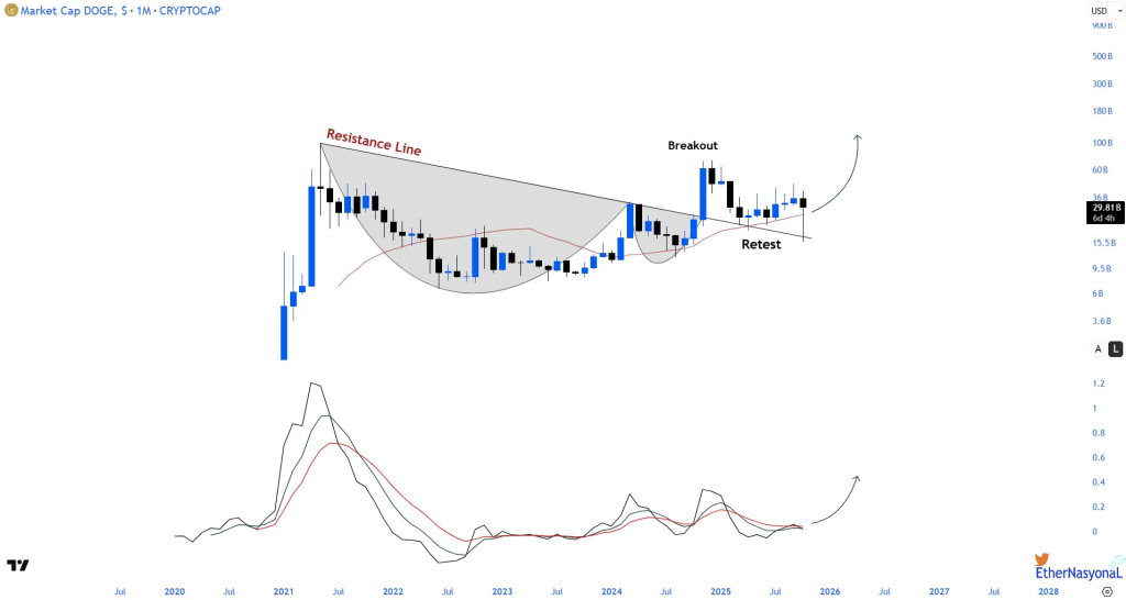 最新分析指出狗狗币呈现有利的技术形态。加密分析师Patel指出,曾在2017年和2021年推动$DOGE暴涨的相同模式正在重演。这种包含突破后回测的形态,历史上曾多次成功推动价格大幅上涨。