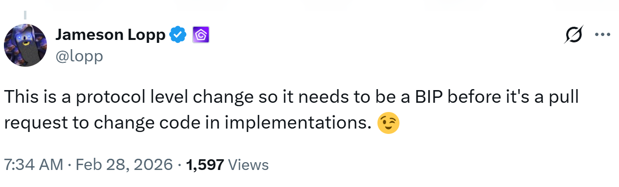 “我需要明确声明:这将是一次硬分叉。它会使原本无效的交易变为有效。所有节点都需在激活高度前完成升级。我并非试图掩饰这一事实,或将其伪装成其他方案。”他补充道。
