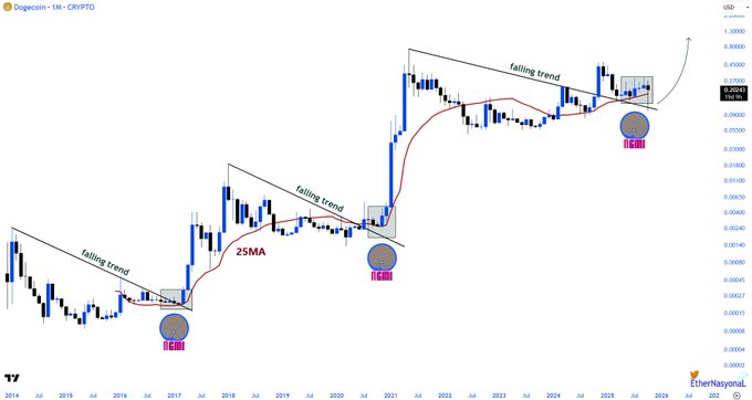 分析师EᴛʜᴇʀNᴀꜱʏᴏɴᴀL(@EtherNasyonaL)分享的长期图表清晰展现了狗狗币价格演变的历史韵律。过去十年中,每次重大上涨趋势都始于价格持续站稳25个月简单移动平均线(25MA)、确认突破下降趋势线,以及伴随投资者怀疑情绪的重新测试阶段。这种反复出现的结构印证了狗狗币大级别价格周期始终遵循可识别的技术条件。