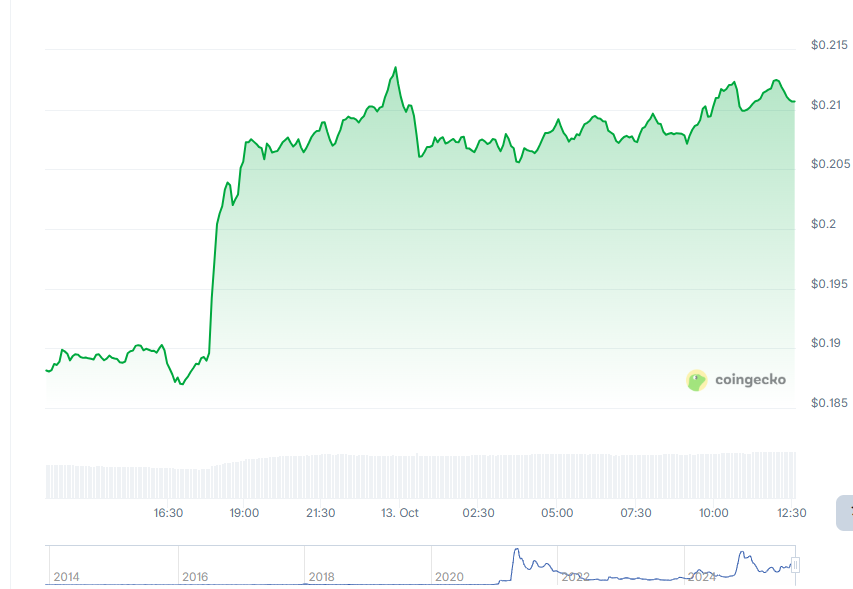 同期0.187-0.2136美元价格区间显示突破前期整理的决定性走势。伴随价格上涨的成交量放大表明市场正在重新积累且参与度增强,暗示投机者和机构交易者可能在数周低波动后重新关注该资产。