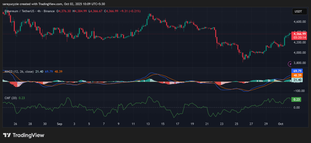 在ETH四小时技术图表中,MACD线位于信号线上方显示看涨动能。CMF指标0.23的正值表明市场存在强劲买压,暗示资金正持续流入该资产。只要这种势头得以维持,上涨趋势可能持续。