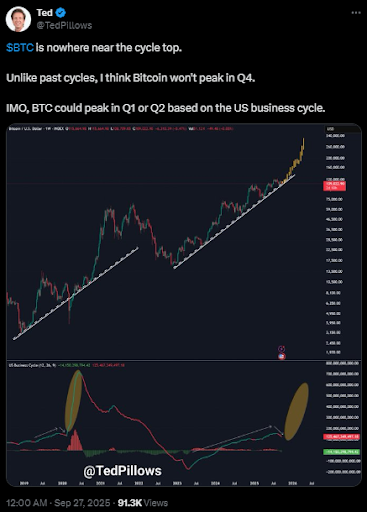 $BTC峰值或出现在Q1/Q2而非Q4 | 来源:Ted Pillows, X