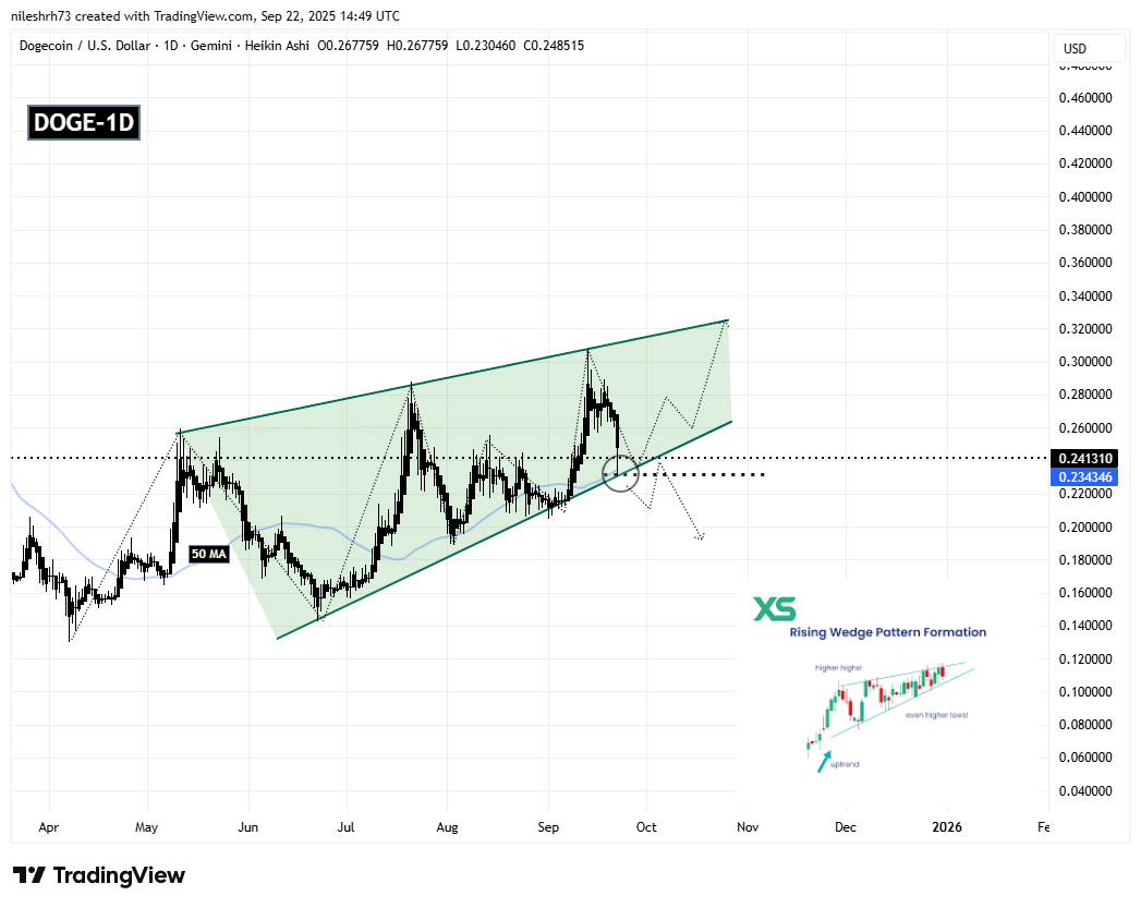 价格在触及0.3068美元附近的上升阻力趋势线后遭遇拒绝,触发最新一轮抛售,将DOGE打压至楔形下轨0.2304美元附近。值得注意的是,该位置恰好与50日均线重合,强化了其作为关键支撑区的作用。