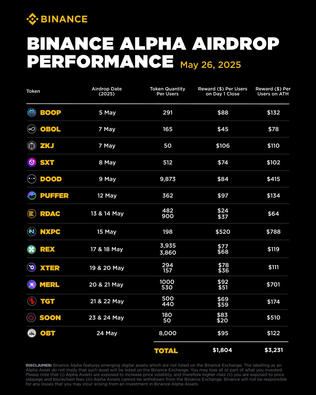币安Alpha积分是接收币安Alpha空投和参与TGE的必要条件。币安Alpha空投是将未来币安Alpha代币的份额免费分给达到最低积分要求的用户,这些空投价值可达每位用户数百美元。值得注意的是,仅在今年5月1日至5月26日期间,币安Alpha向每位用户分发的空投价值就高达3000美元,且活动仍在继续。