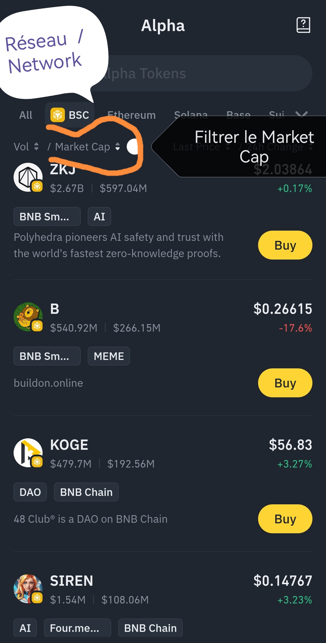 1️⃣ 在Alpha上交易BSC网络中市值最高且价格波动低的代币。您可按如下方式筛选市值和选择网络:
