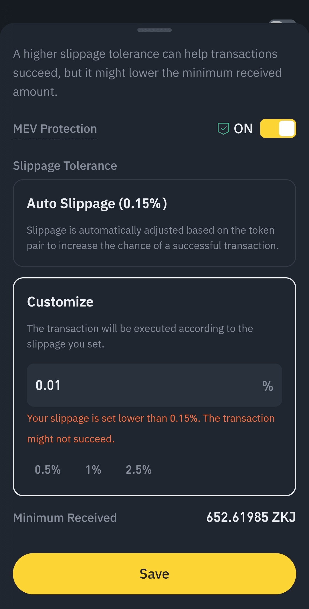 3️⃣ 将滑点设置为最低0.01%(而非默认的1.1%)。这将提供更有竞争力的价差,且交易总能快速成交。