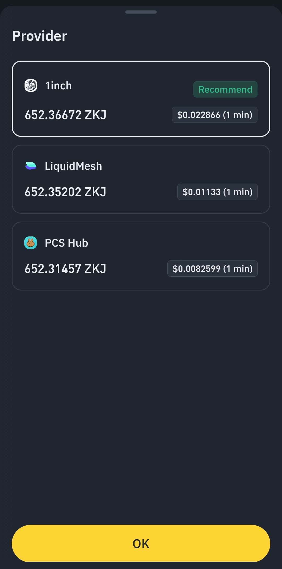 4️⃣ 选择正确的提供商(PancakeSwap或1INCH)。PancakeSwap可能不太有利,因此请始终检查哪个提供商能提供最佳代币回报。