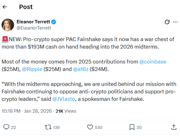 加密PAC Fairshake以迄今为止披露的最大规模战争资金之一进入2026年选举周期。该PAC将自己定位为影响关于稳定币、执法权限和消费者保护的辩论。监管结果仍不确定。