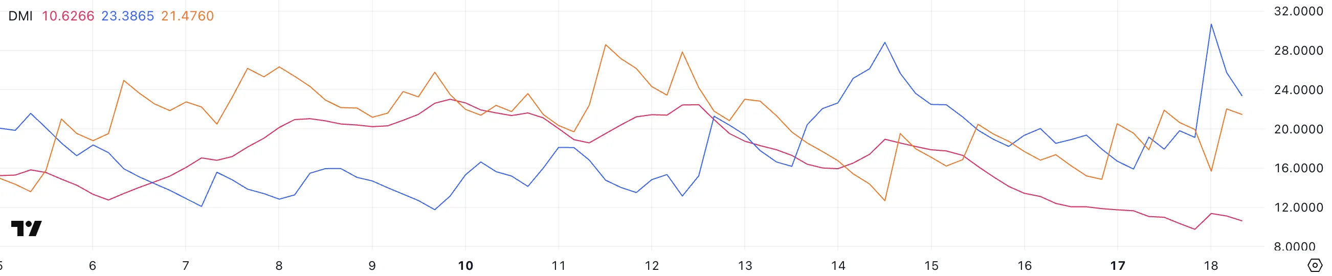 数据显示,HYPE的ADX(平均趋向指数)已从四天前的18.9下降至10.6,表明趋势正在减弱。ADX低于20通常意味着缺乏强劲的方向性动能,即当前市场走势缺乏确定性。与此同时,+DI(正向指标,23.3)仍略高于-DI(负向指标,21.4),表明看涨压力依然存在但并未占据主导。