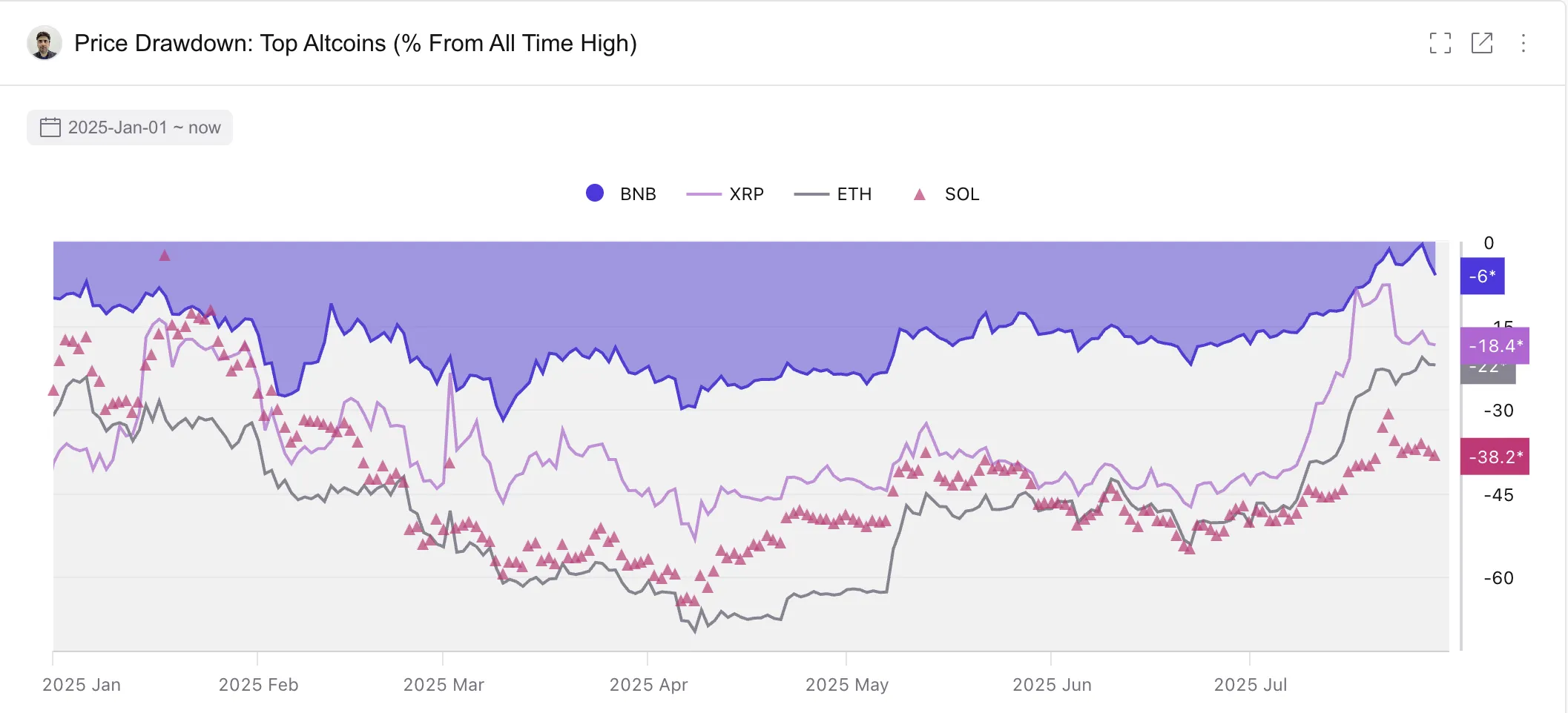 在市值前列的山寨币中,BNB当前技术面表现最为强劲,距历史高点仅差12.3%。其独特之处在于2025年全年始终保持低于30%的回撤幅度(据年内回撤数据),这在波动剧烈的加密市场实属罕见。