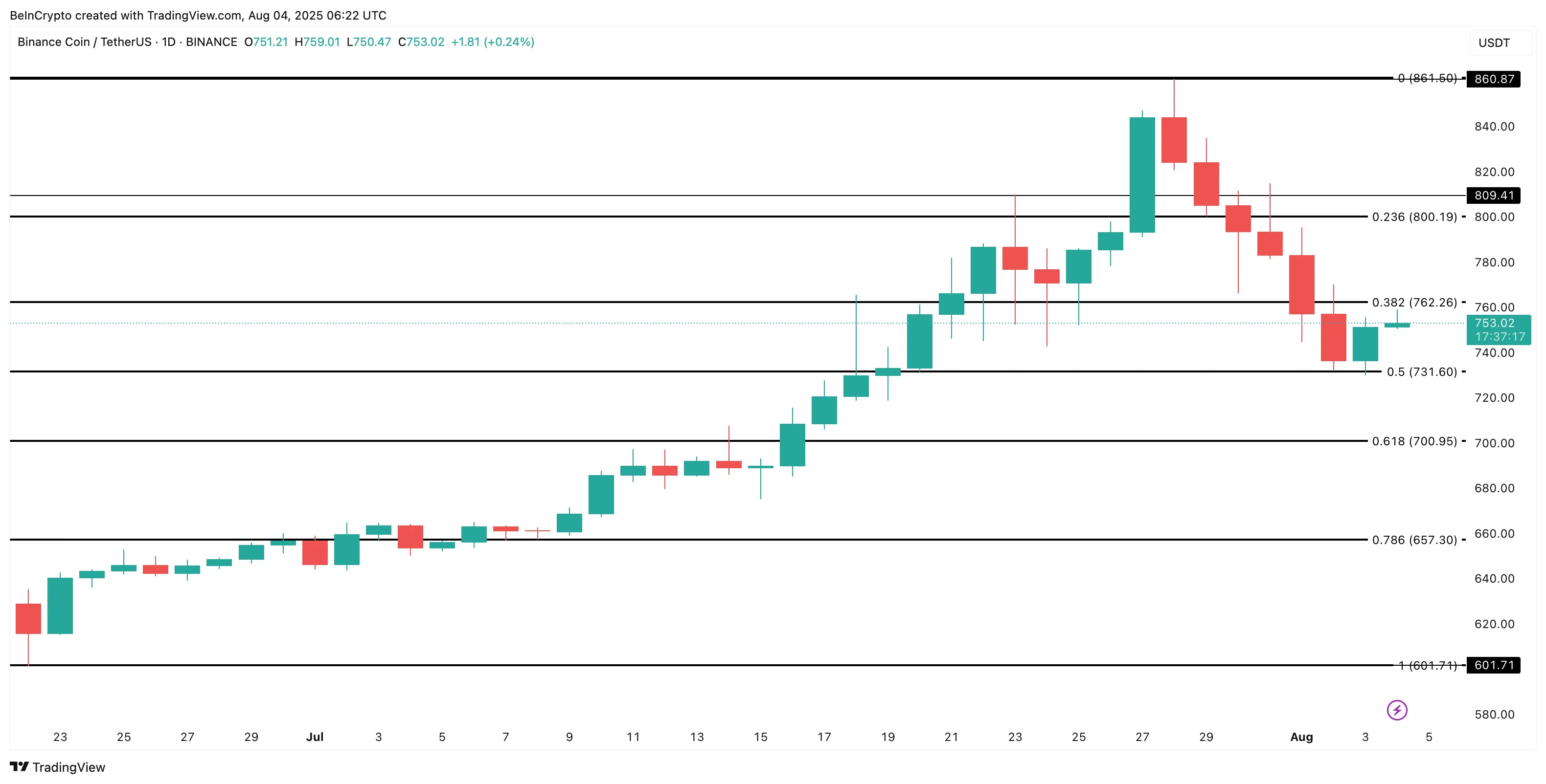 币安生态的实际应用支撑着投资者信心,BNB链上月活跃度11%的环比增长更强化了其链上动能。当前BNB交易价约753美元,坚守在731美元斐波那契关键支撑位上方(该点位基于601美元六月低点至809美元近期高点的回撤测算)。
