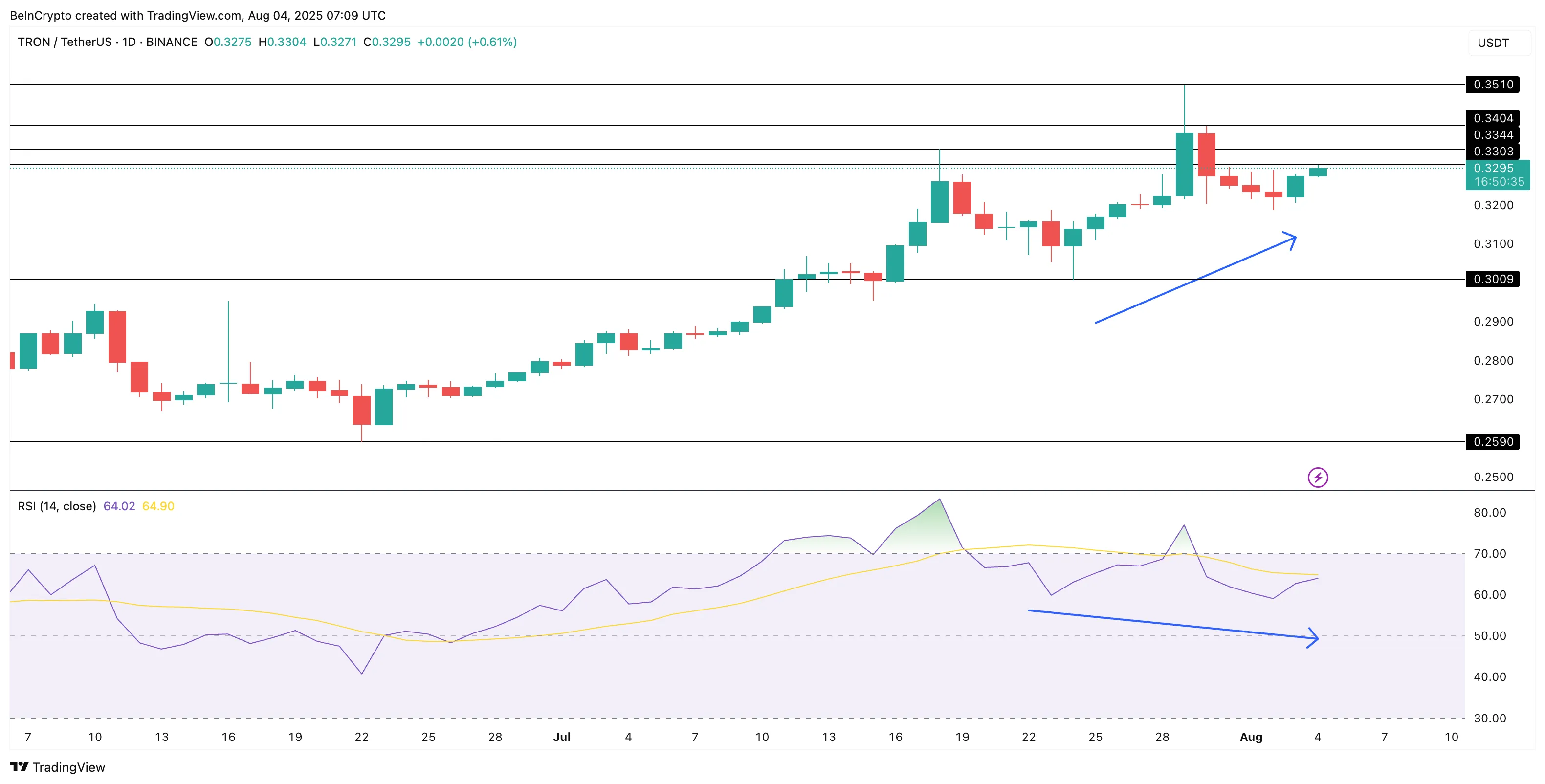 从0.25美元冲高至0.33美元后的健康回调至0.30美元,在二日图上呈现教科书般的斐波那契延伸结构。当前0.34美元成为关键阻力位,突破后或将推动价格挑战0.42美元(1.618延伸位),甚至突破前高。若分形完全兑现,100%涨幅可期,目标位看至0.70美元。日线图上隐藏的看涨背离(价格低点抬高而指标走低)进一步强化了这一可能性。