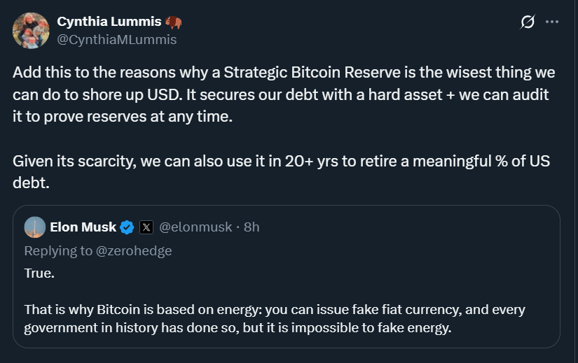 卢米斯向马斯克重点阐述了战略比特币储备计划,解释美国政府如何通过建立战略储备来接纳比特币。她强调这是强化美元信用并解决国债问题的最佳策略。