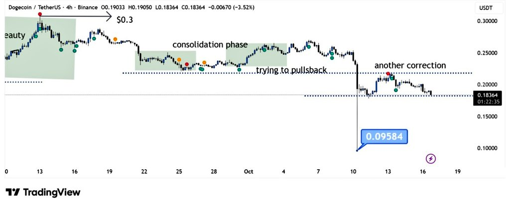 市场结构显示DOGE持续形成更低的高点,这种形态自上次峰值后便已确立。尽管多次尝试反弹,买盘始终未能维持动能。整体趋势依然偏向下行,复苏乏力且支撑位持续承压。