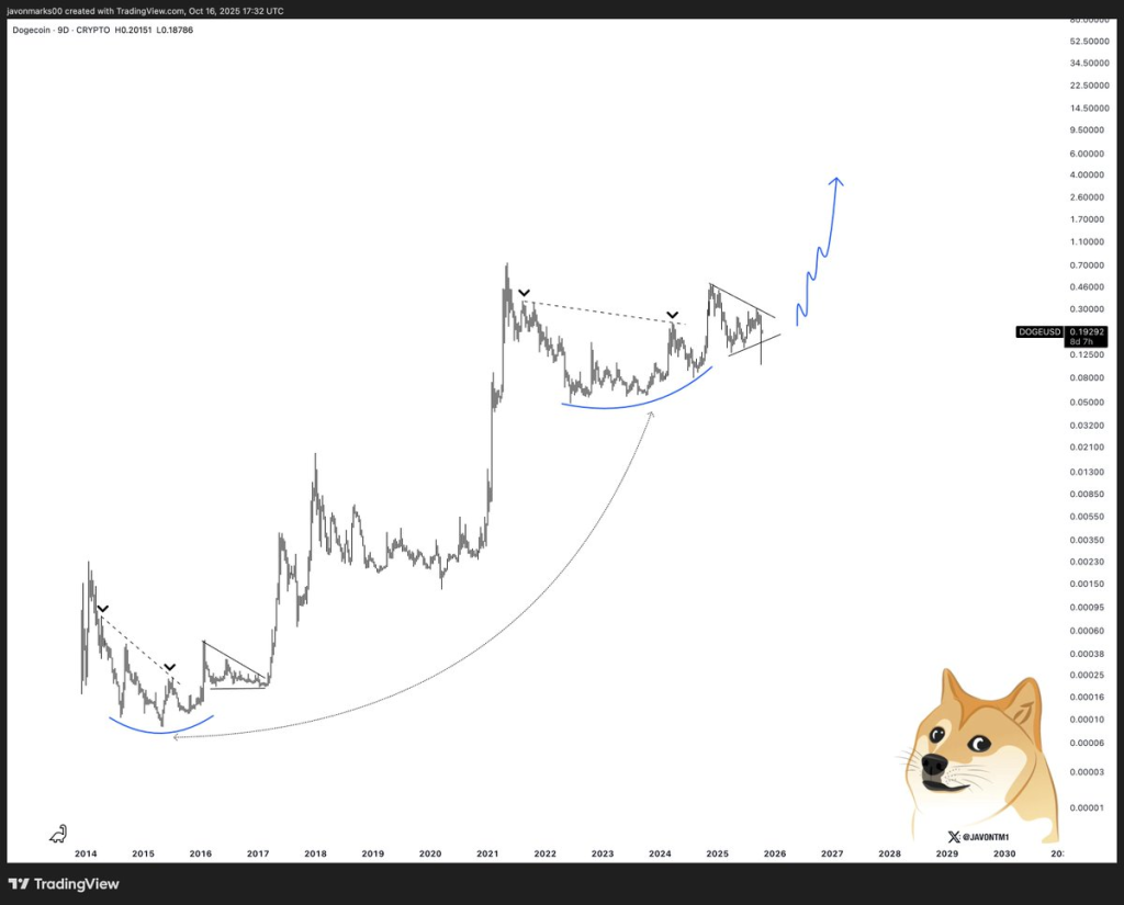 部分交易者跳脱短期压力审视格局。图表分析师Javon Marks指出,DOGE可能正在形成类似2014-2017周期的形态。