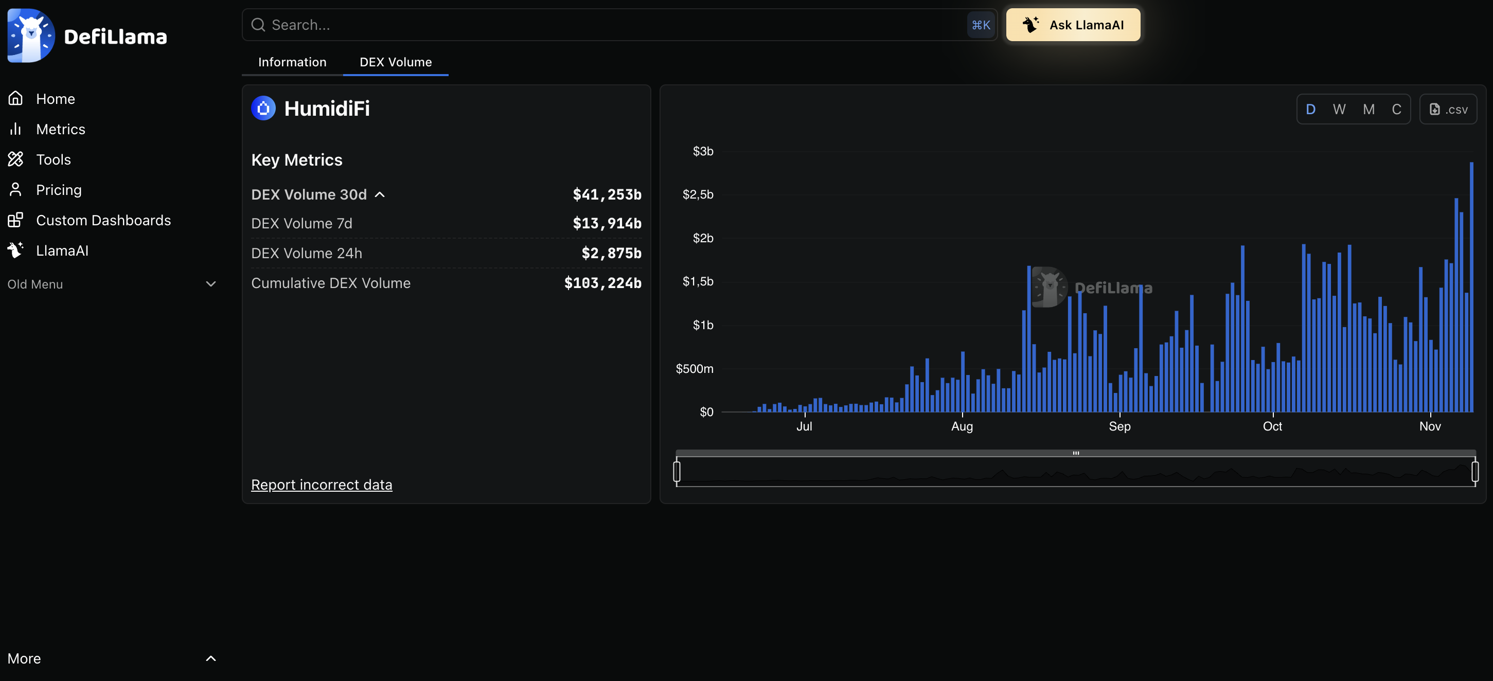 数据显示,HumidiFi在过去24小时内实现了28.7亿美元交易量,过去7天达139亿美元,最近30天更是突破412亿美元大关,持续保持着网络中最活跃DEX的地位。