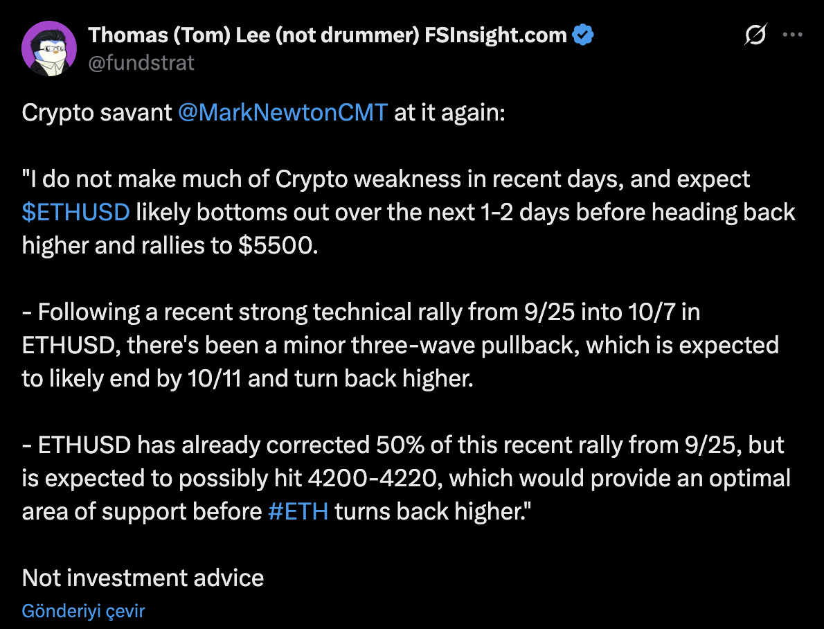 在价格急剧下跌的背景下,以太坊因市场预期升温再度成为焦点。Fundstrat技术策略总监马克·牛顿(Mark Newton)指出,这场对第二大加密货币短期底部的探寻已接近尾声。他预测以太坊可能攀升至5,500美元,并认为下行压力正在减弱,走势或将很快逆转上行,重现9月末的反弹行情。该观点通过汤姆·李(Tom Lee)的社交媒体账号获得广泛传播。
