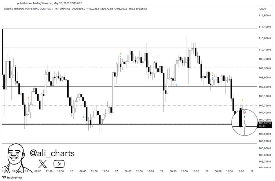 区域,该位置曾多次成为短期反弹的跳板。他在社交平台X发文强调:"比特币TD序列指标在小时图发出买入信号,且当前价格正处于历史支撑位!"