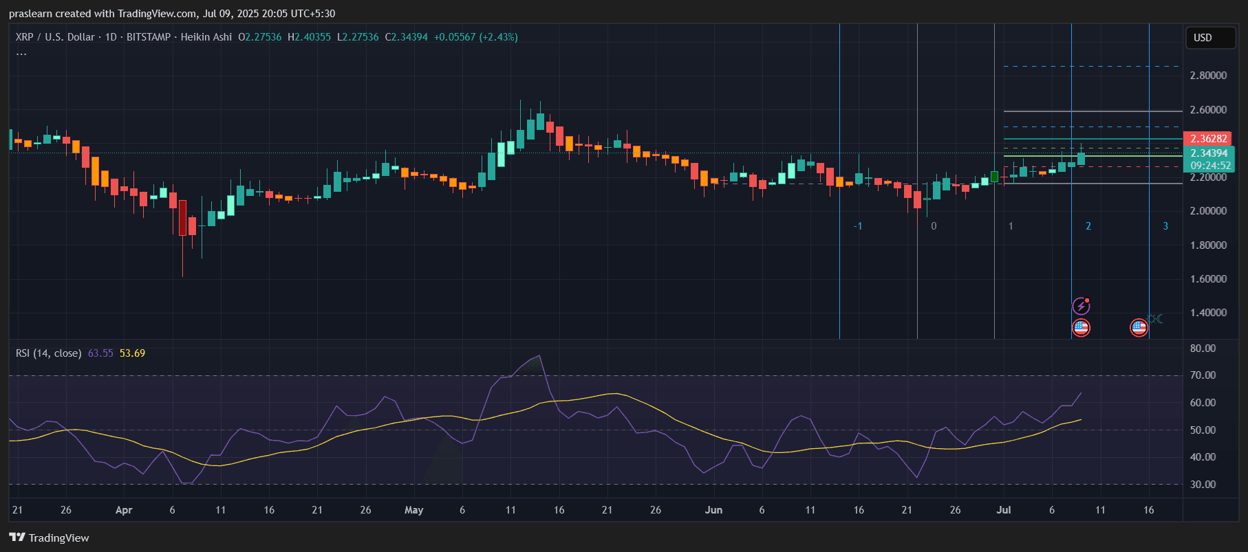 您分享的Heikin Ashi日线图显示,XRP价格正展现出新的看涨动能。当前日线蜡烛收于2.34美元附近,单日涨幅达+2.43%。相对强弱指数(RSI)升至63.55,表明强劲的买盘压力——但尚未进入超买区域。
