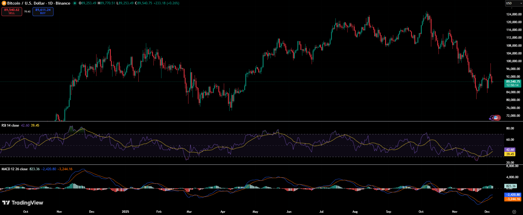 技术图表支持这种方向不明的市场叙事。日线RSI位于42附近,徘徊于中性区域下方,表明动能正在冷却而非耗尽。同时RSI移动平均值接近39,暗示动能并未强势恢复,空头仍保持轻微优势。