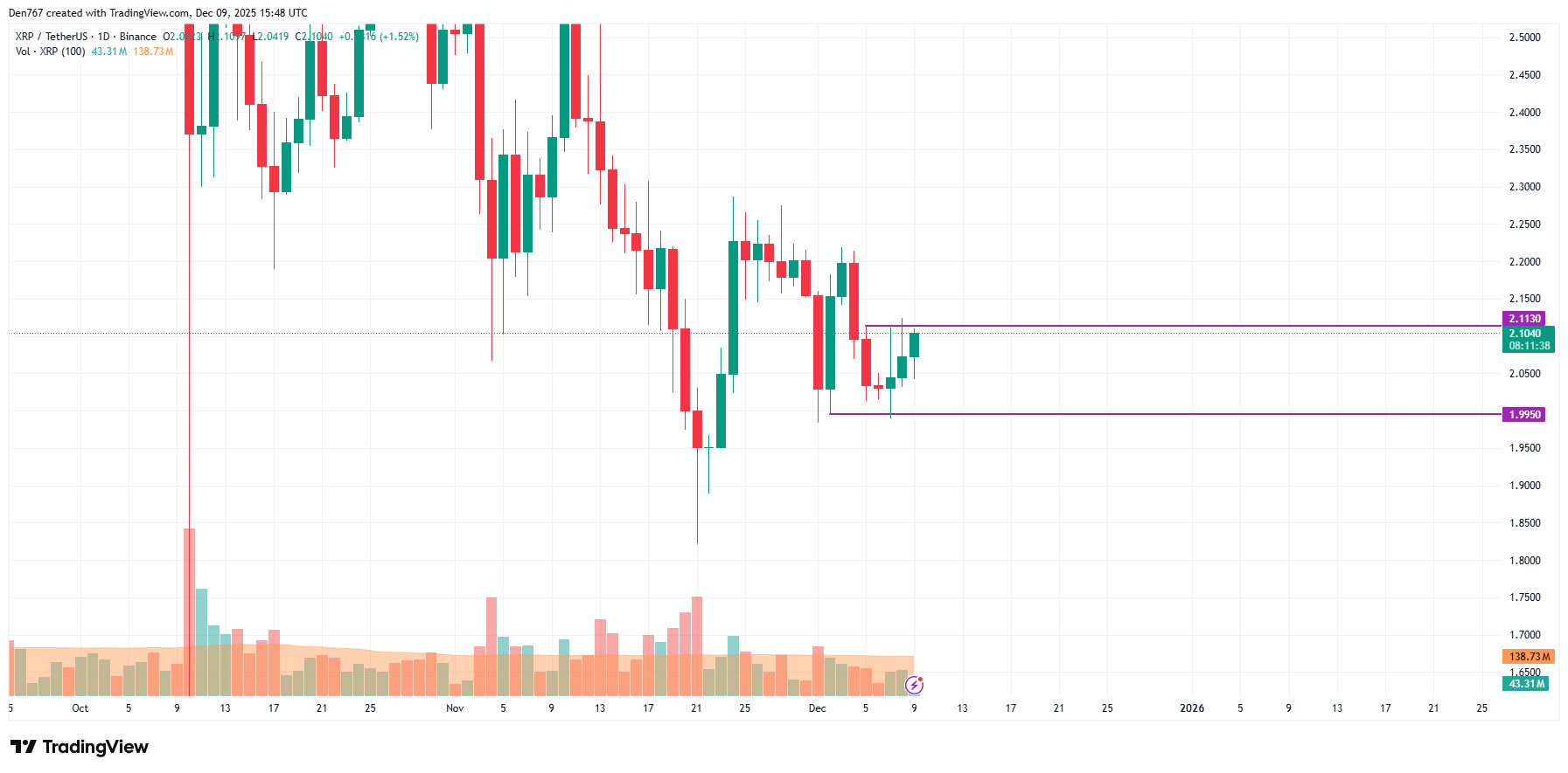 XRP汇率突破2.0827美元局部阻力位后呈现上涨态势。若日线收盘价能站稳该位置上方,短期内极有可能测试2.15美元区间。