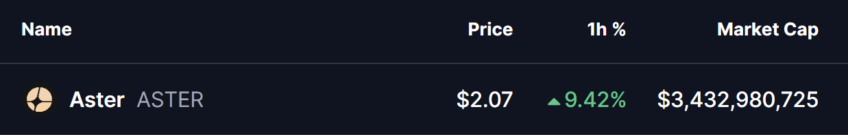 2025年10月6日 GMT时间上午8:40,随着全球最大加密货币交易所宣布上线Aster(ASTER),该代币价格出现显著飙升。这家去中心化永续合约交易所的代币在过去一小时内暴涨超9%,市场热情推动其价格跃升至2.07美元。