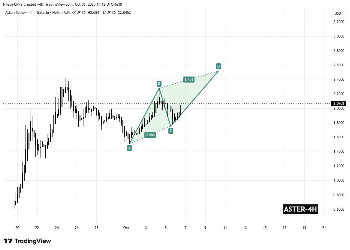 形态始于从A点(1.5093美元)至B点的急速拉升,随后回调至C点(1.7493美元)。当前ASTER已从该基点强势反弹至2.07美元附近,确认CD段正在进行。