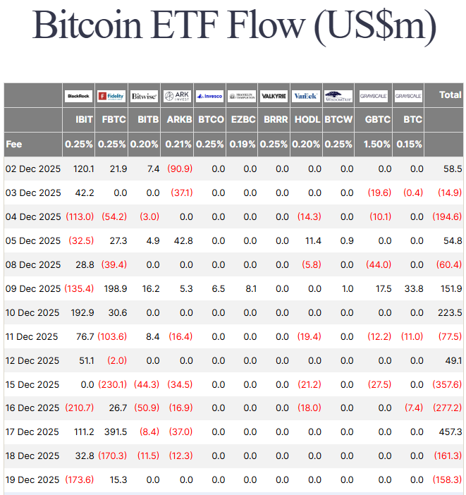 与此同时,机构兴趣减弱似乎也影响了整体市场情绪。数据显示,美国现货比特币ETF在12月19日录得1.583亿美元资金流出,其中贝莱德IBIT单日流出1.736亿美元。此外,该投资工具本周净流出达4.97亿美元,仅有一日录得资金流入。