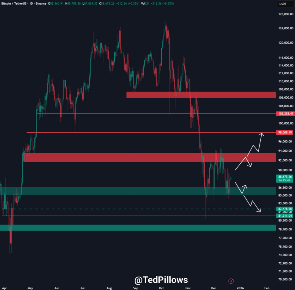 关键洞察:比特币价格预测升至10万美元的预期在盘整阶段逐渐升温。近日,BTC价格持续在8.8万至9万美元区间震荡。一位顶级分析师预测,BTC兑美元汇率可能逆转至12万美元。