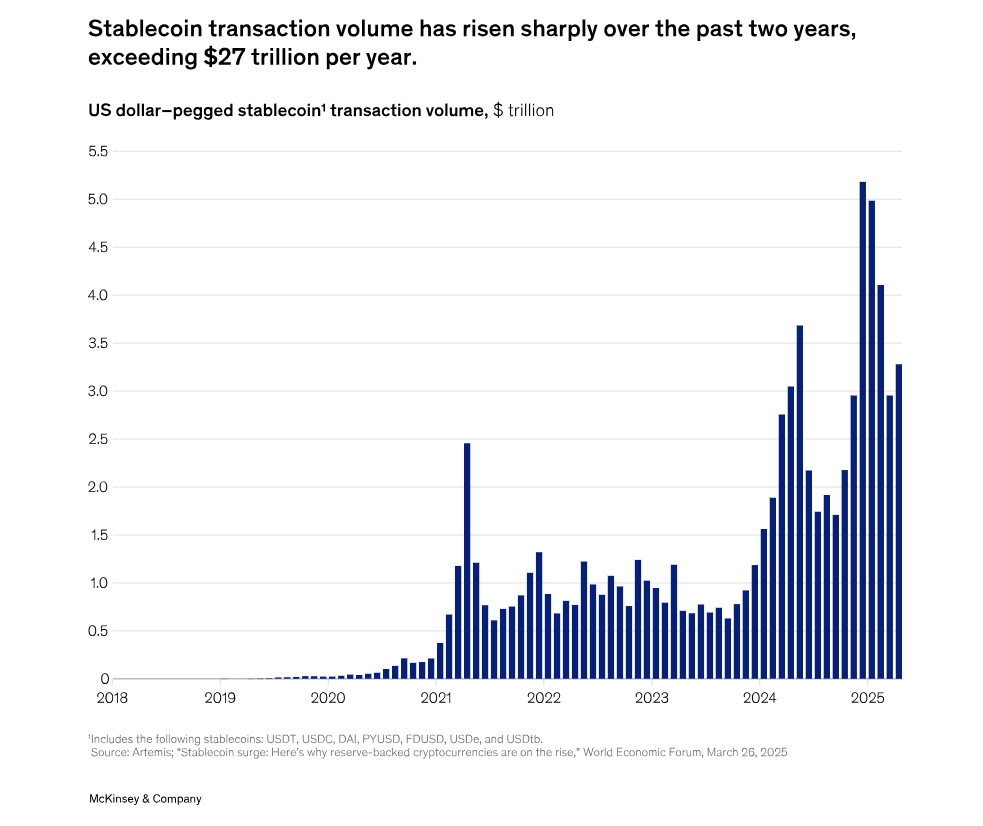 麦肯锡数据显示,当前已发行稳定币总价值在18个月内翻倍至2500亿美元,预计2028年将突破2万亿美元。尽管目前仅占全球汇款总额的1%,但稳定币凭借实时结算、低操作风险和全球可用等优势,有望十年内超越传统支付系统,在汇款和资本市场领域展现出强劲吸引力。