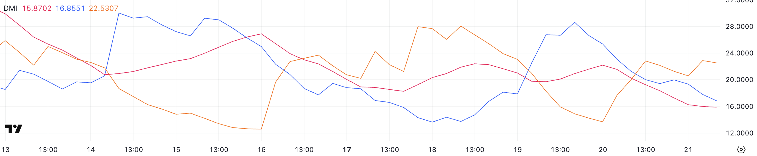 Solana的DMI图表显示,ADX已从昨日的22.18降至15.87。平均方向指数(ADX)衡量趋势强度,数值高于25表明趋势强劲,低于20则表明价格走势疲软或处于盘整阶段。