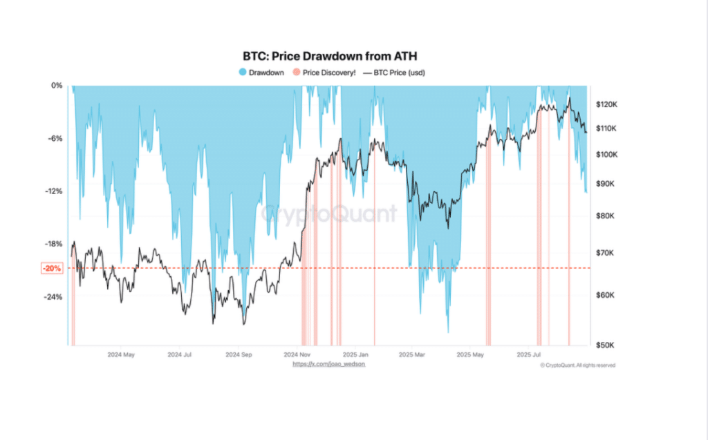CryptoQuant链上分析表明,比特币从123,000美元的历史高点回落至108,000美元附近,这与过往修正走势一致。研究指出,这种调整有助于市场在强势增长后进行自我修复。历史数据显示,即便在强劲上涨周期中,20%-25%的修正也屡见不鲜。