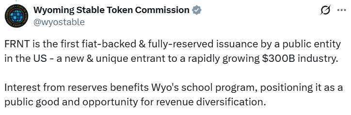 FRNT由七人组成的怀俄明州稳定币委员会设计,面向个人与机构用户开放。州长办公室声明称,该代币由美元及短期美债全额抵押,储备金产生的利息收入将归入州财政。